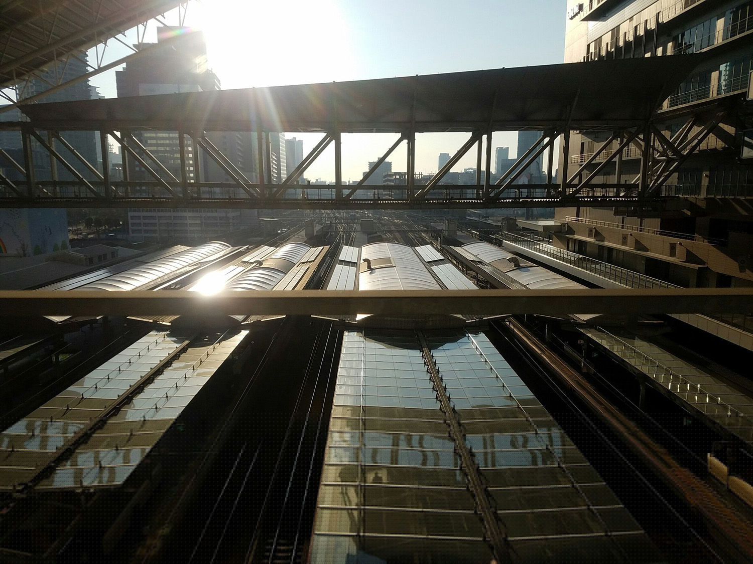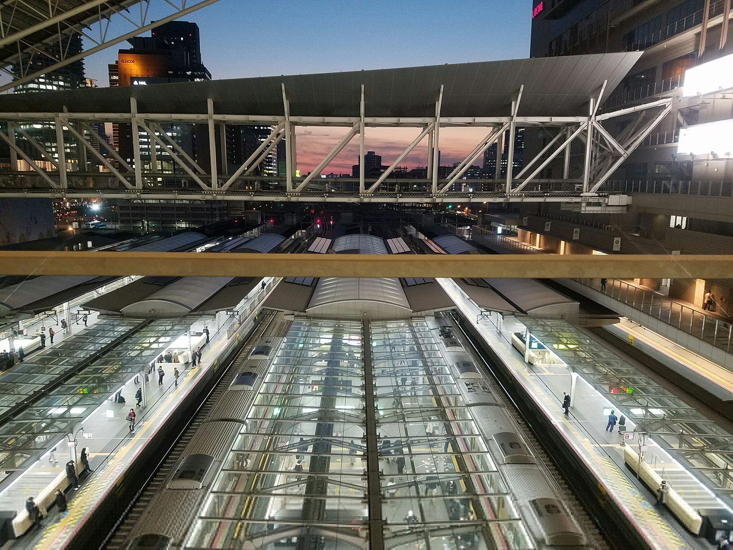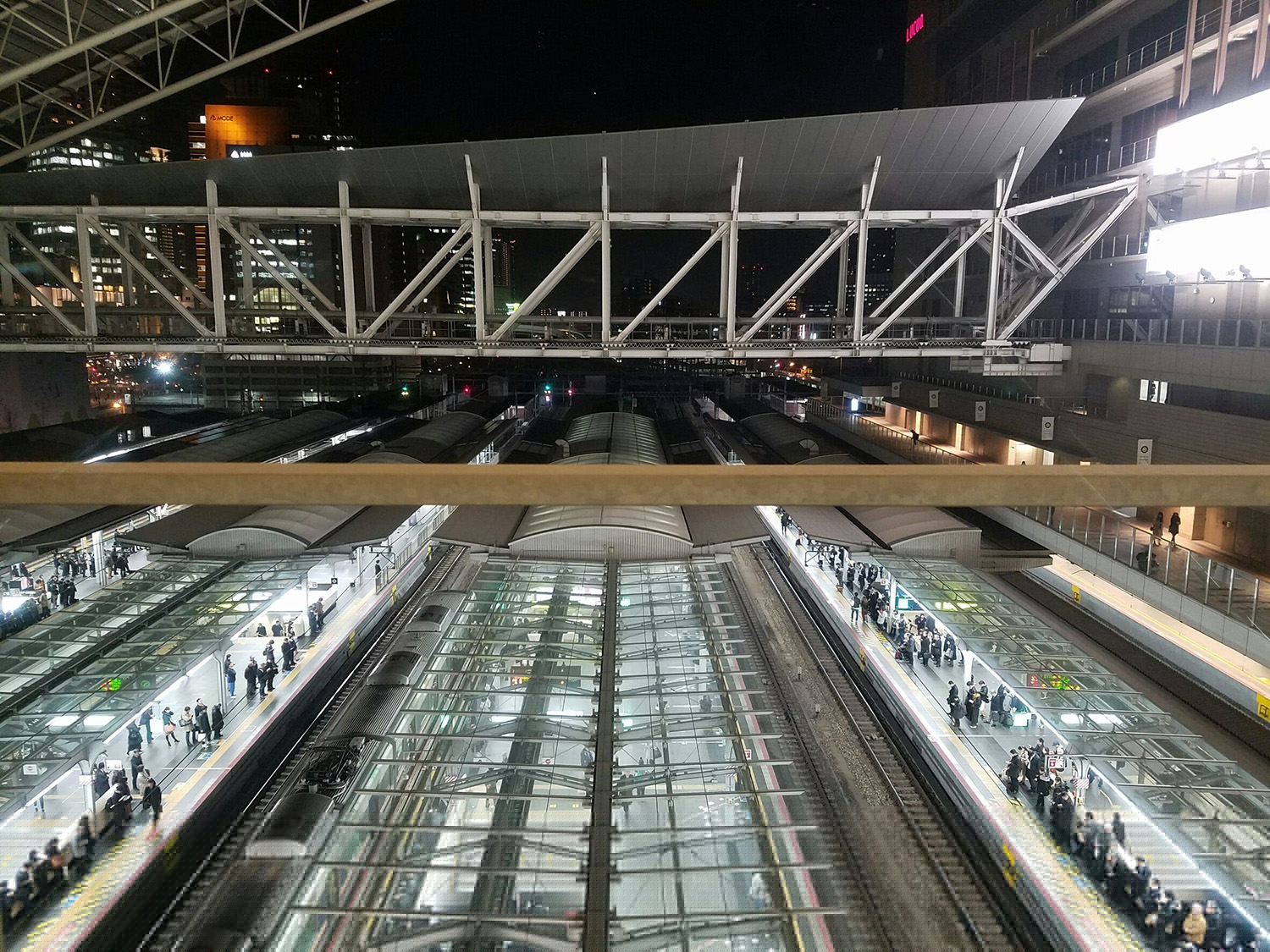 昼間から夜まで、大阪駅の各ホームごとの様子を撮影した写真を