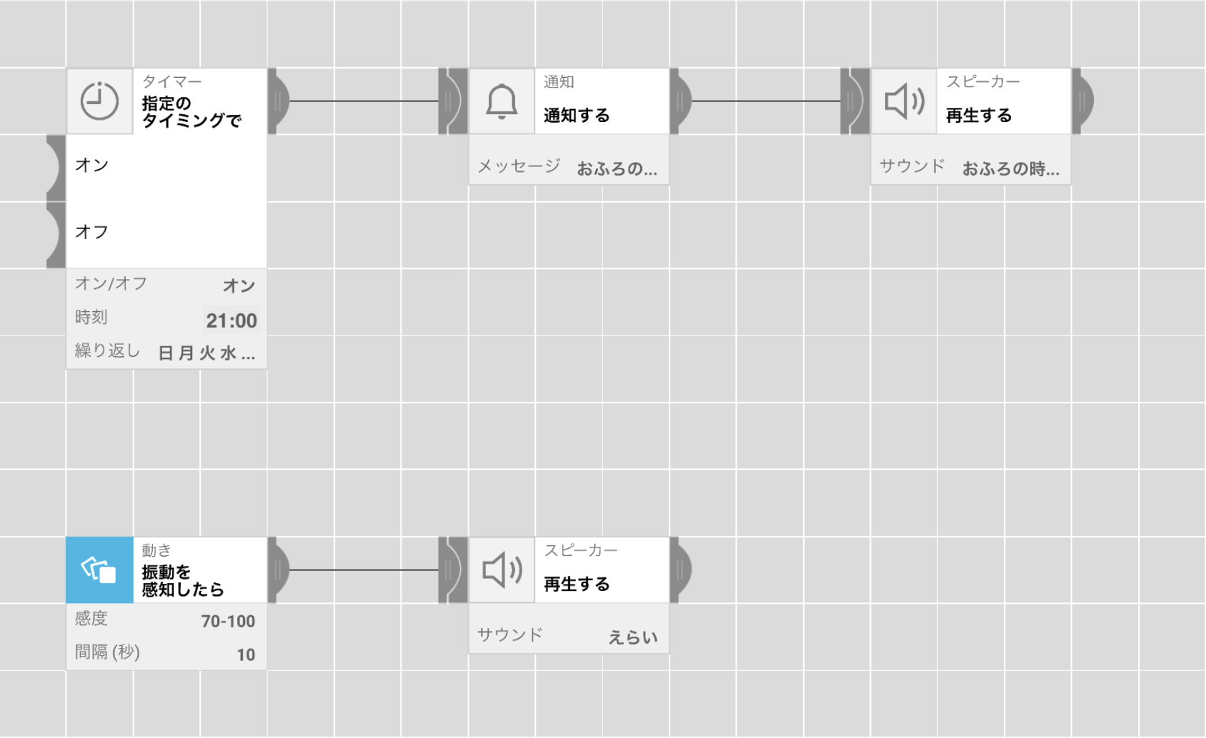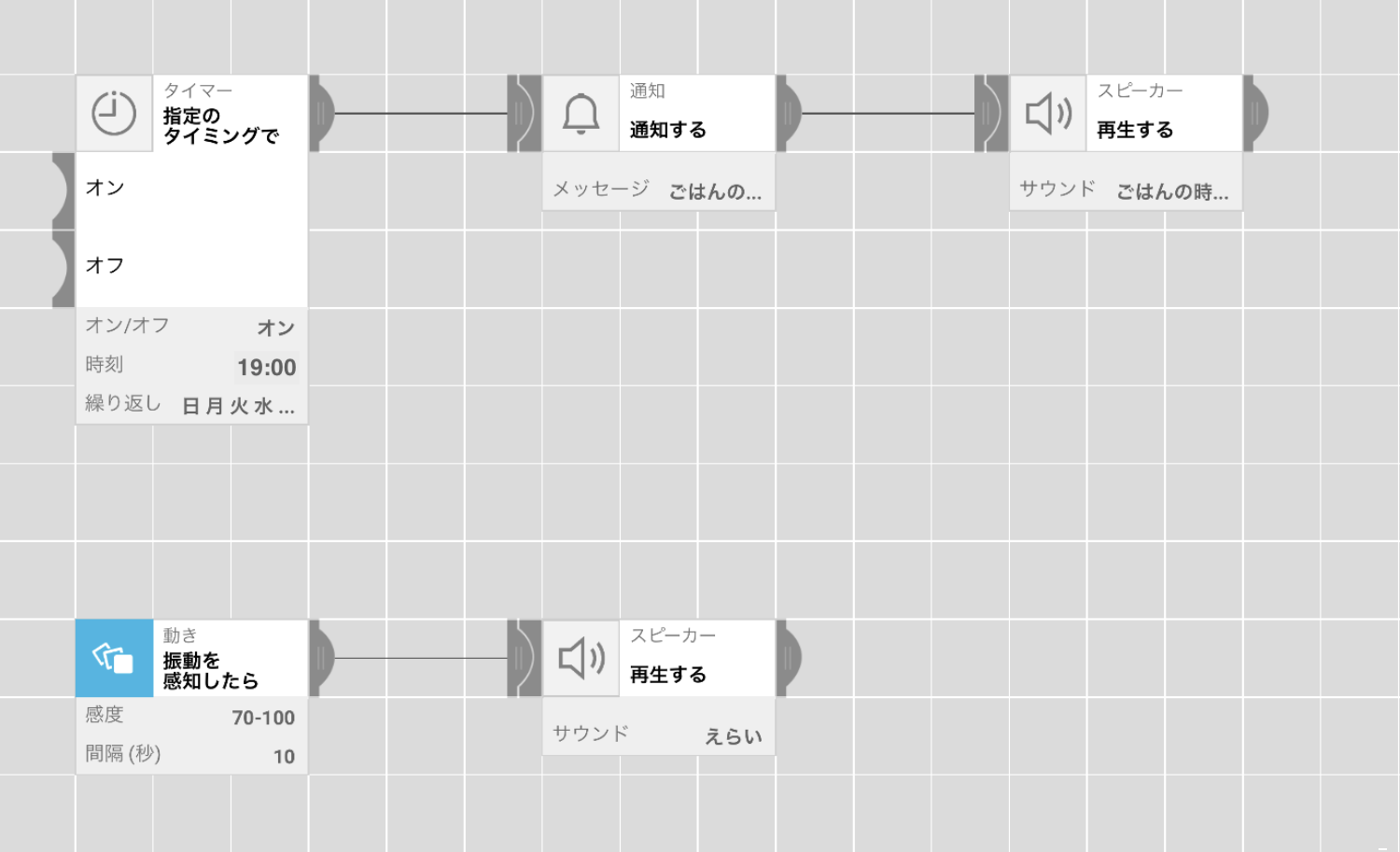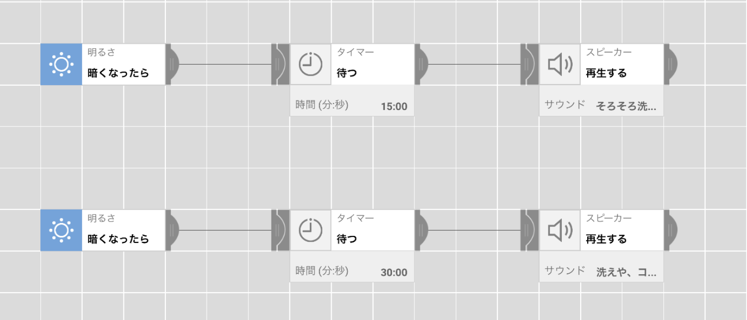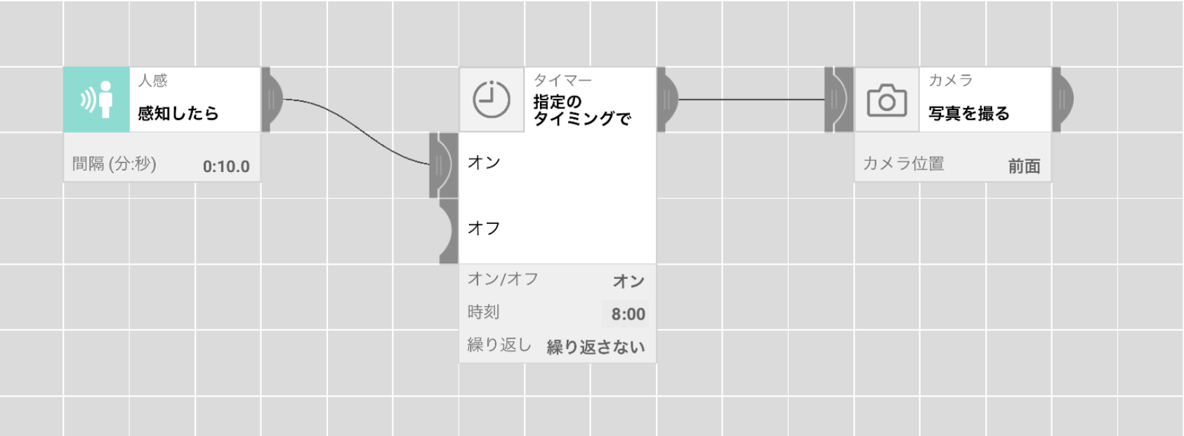 一定の時間になると、メッセージと声でお知らせ。ドアを開けたら【動きセンサー】、「えらい!」とほめてくれます。
