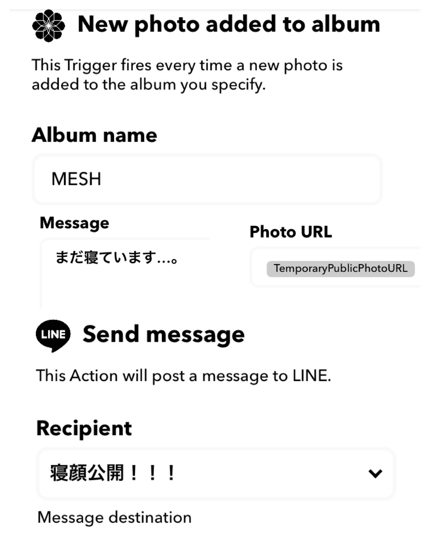 【IFTTT】というアプリで、「MESH」というアルバムに写真が入ったら、LINEで送られる仕組みをつくりました。