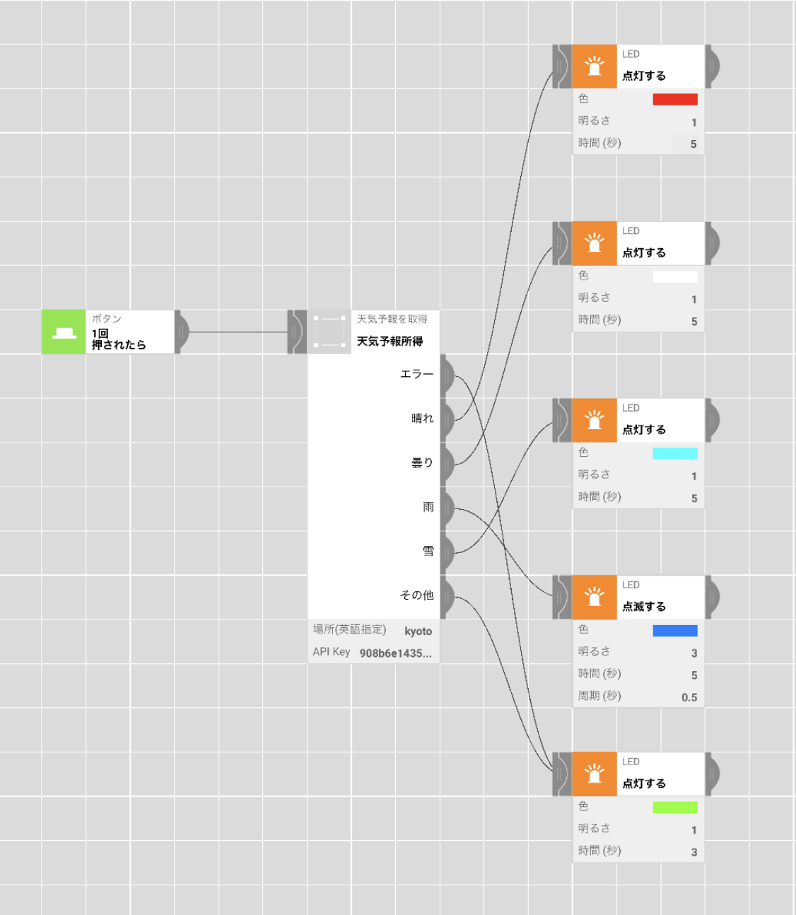 ボタンを押すと【ボタンセンサー】、その日の天気を光の色【LEDセンサー】でお知らせ。玄関に設置すれば、効果アップです。