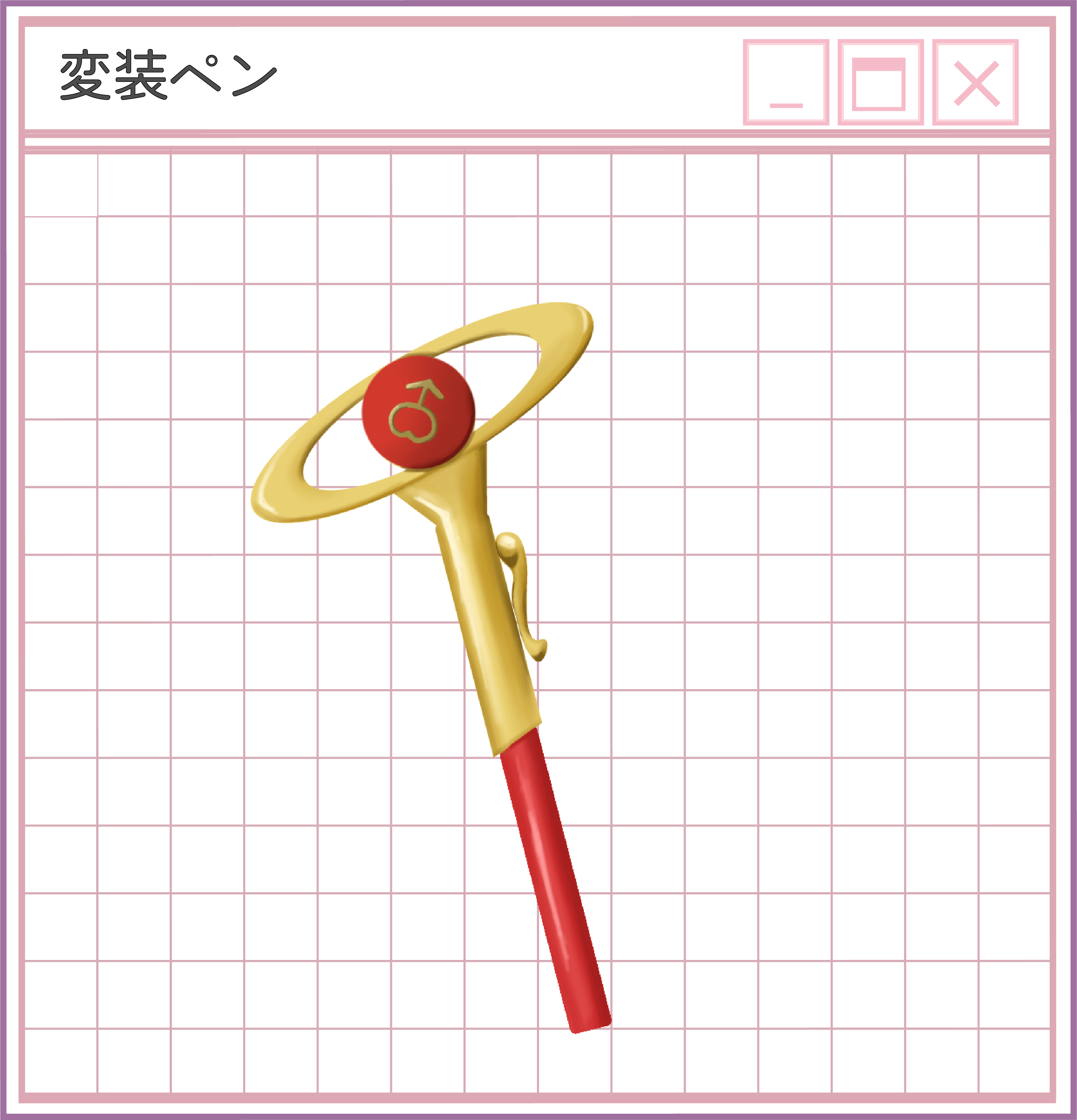 50年代周辺に全盛期を迎え、アニメ「セーラームーン」が放送開始された90年代には既に身近な文房具であった 万年筆がモチーフとなっている武器。ピンクを基調とし、目を引く宝石が装飾されている。